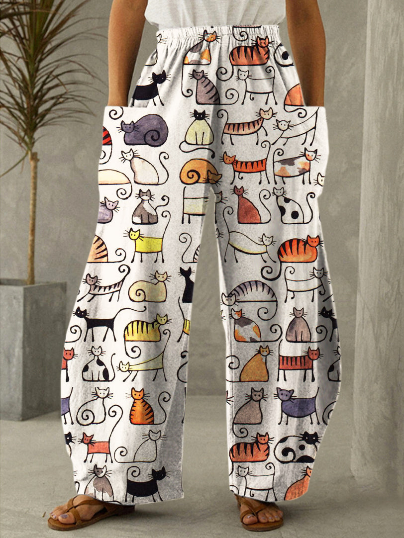 Decrease quantity for Vintage Cat Stick Figures Print Casual Pants