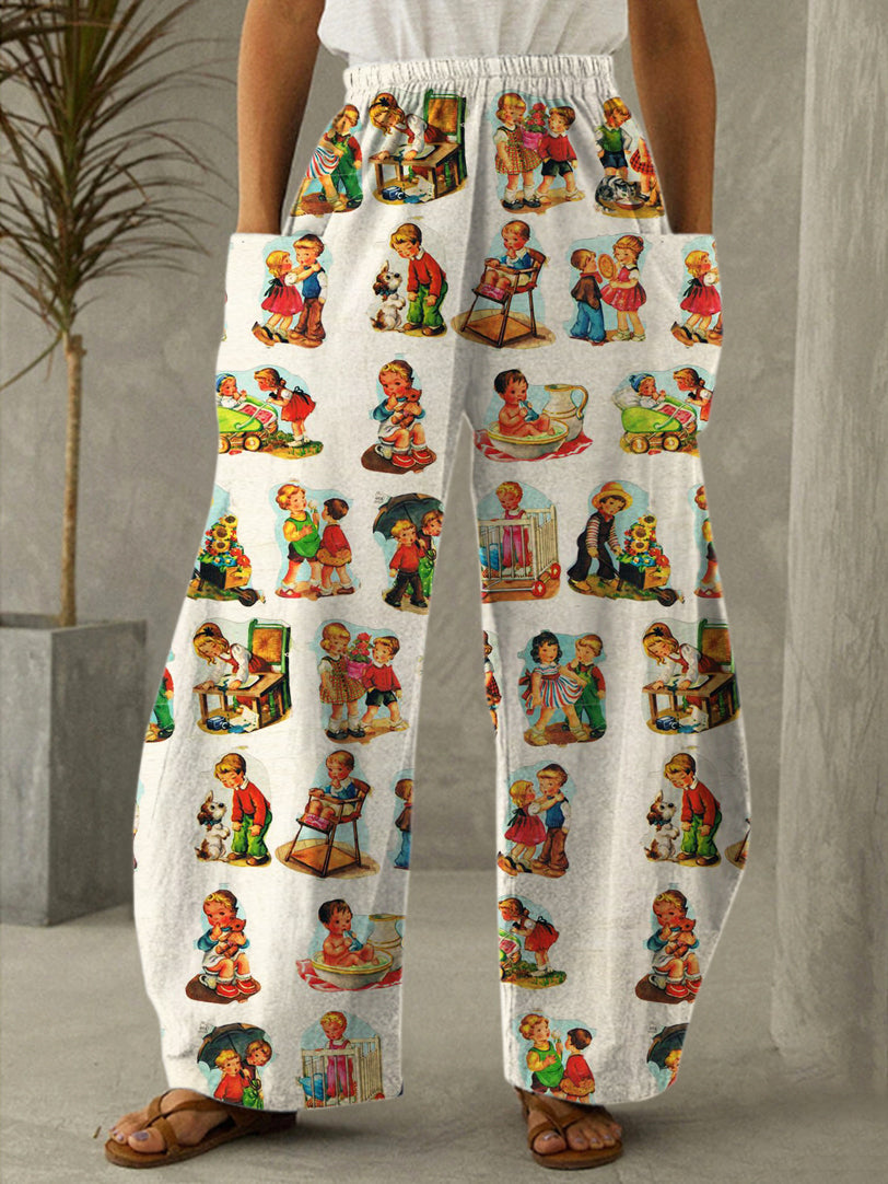 Vintage Children Print Casual Pants