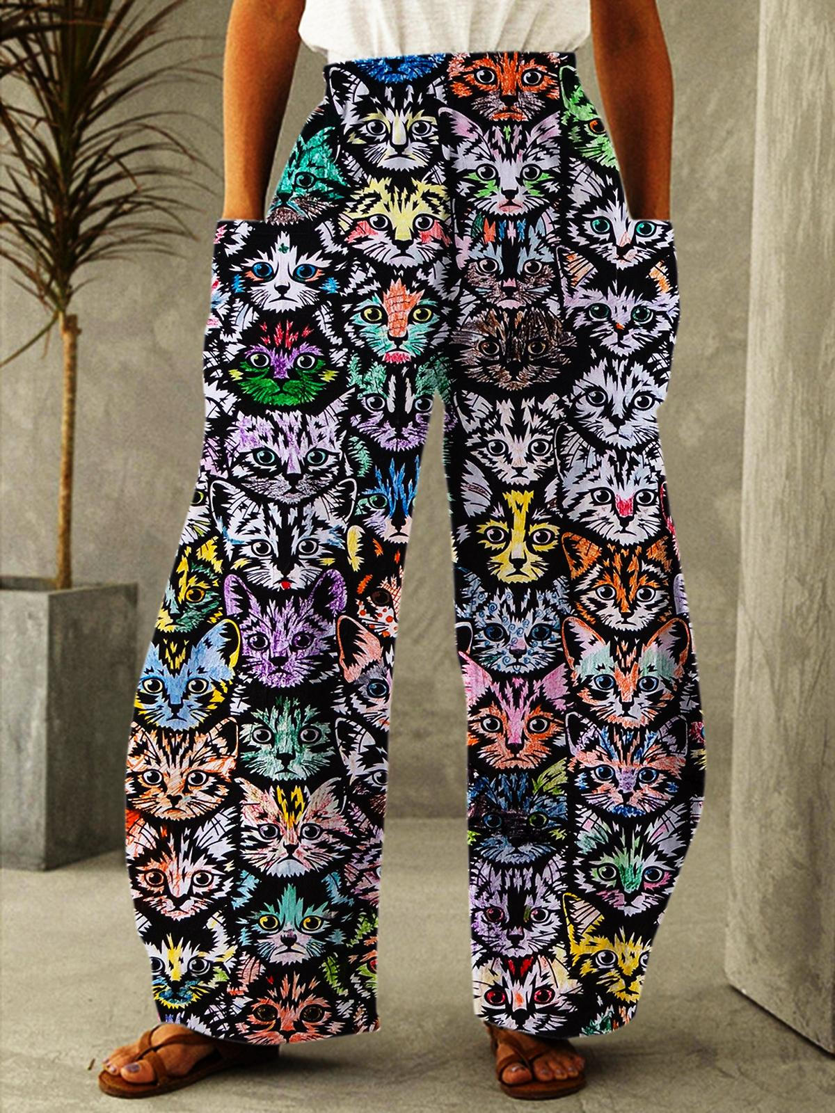 Women's Vintage Cat Art Floral Print Loose Trousers